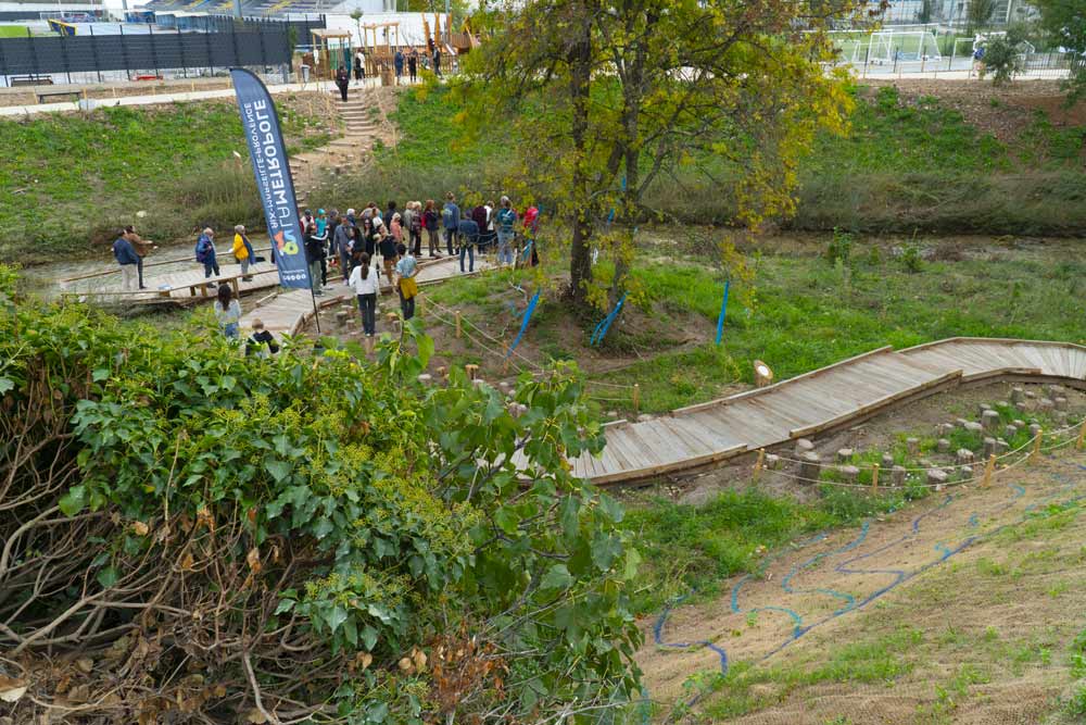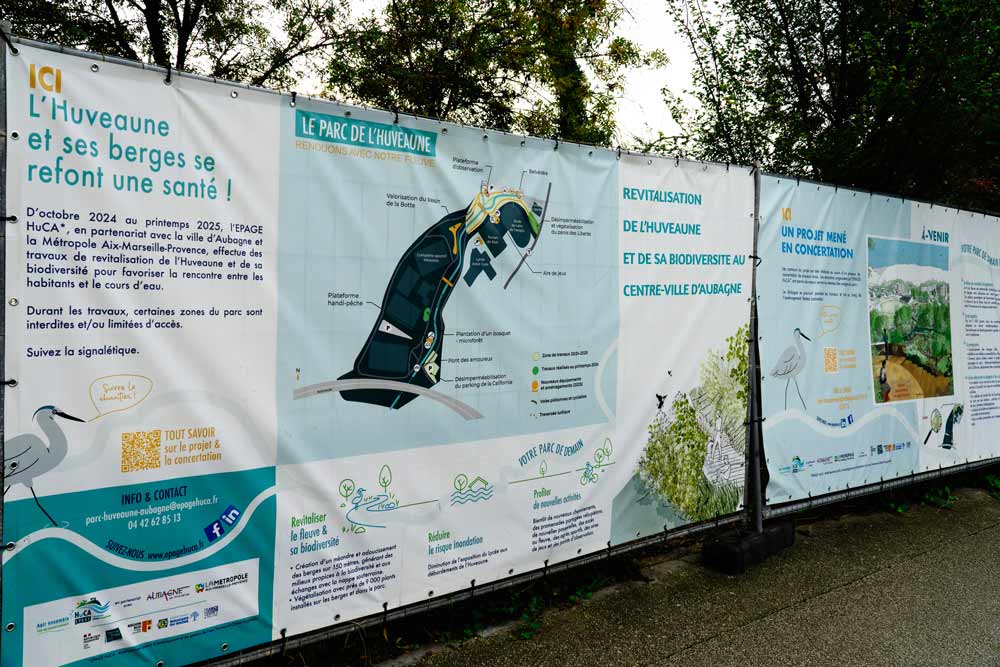Entre le centre-ville d’Aubagne et l’autoroute, le site a fait l’objet d’une requalification visant à redonner toute sa place à la rivière. Sur près de 200 mètres linéaires de berges, les cours de l’Huveaune et de son affluent, les Lignières, ont été restaurés : création d’un méandre, adoucissement des berges et végétalisation avec près de 10 000 plants. Ces aménagements contribuent à la résilience écologique du site et à la réduction du risque d’inondation, en particulier à proximité du lycée Joliot-Curie.