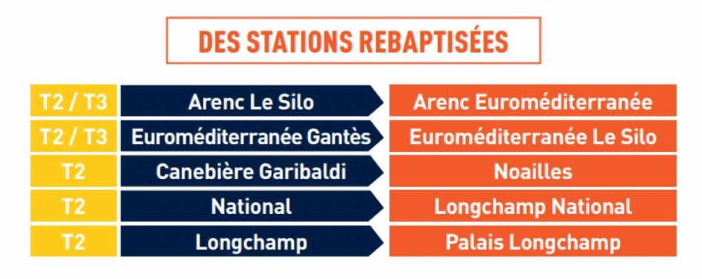 Dans le cadre de l’extension de la ligne T3, au nord en direction de Gèze et au sud vers La Gaye, la Métropole et la RTM ont procédé, début 2026, au changement de nom de cinq stations desservies par les lignes T2 et T3. Cette évolution a renforcé la lisibilité du réseau tramway, permettant d’avoir une meilleure cohérence entre les différents modes de transports et de faciliter l’orientation des voyageurs.