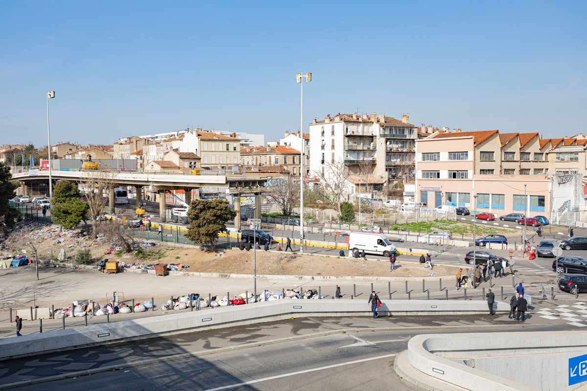 Secteur stratégique particulièrement fréquenté dans le nord de Marseille, l’axe Cap Pinède-Gèze relie les autoroutes A7 et A55. Au niveau de la passerelle, il croise le marché́ aux puces et le récent pôle d’échanges multimodal de Gèze (terminus nord de la ligne 2 du métro de Marseille).