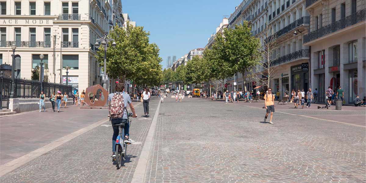 La requalification de Marseille réduit sensiblement la place de la voiture et, par conséquent, favorise le développement des modes de transports doux. Désormais, dans tout l’hyper-centre, sur la Canebière, le cours Lieutaud, le boulevard du Jarret, le boulevard urbain sud… des aménagements permettent une pratique sécurisée du vélo.