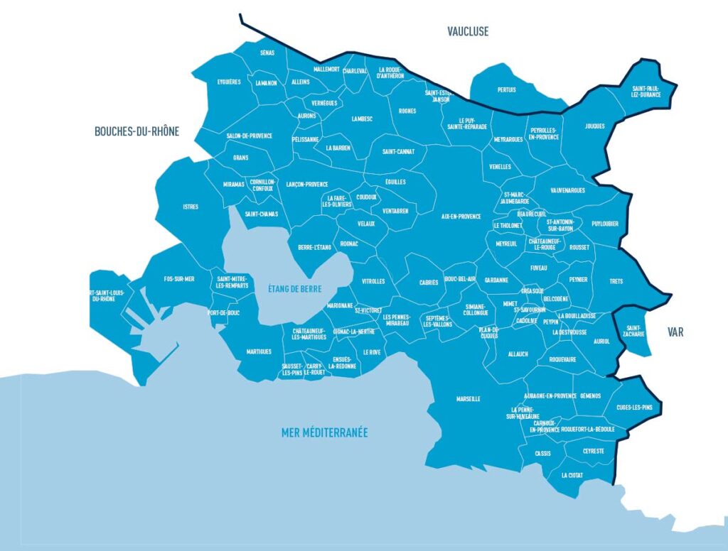 - 92 communes : 90 dans les Bouches-du-Rhône, 1 dans le Vaucluse (Pertuis) et 1 dans le Var (Saint-Zacharie)